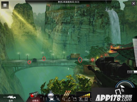 没错,这也就说明了,该关卡除了有两个目标敌人外,还有另外一个敌人,那就是狙击手了(万恶的狙击手(ー`´ー),这也是另该关卡难题提升的原因。那么,我们要怎么完成任务呢?