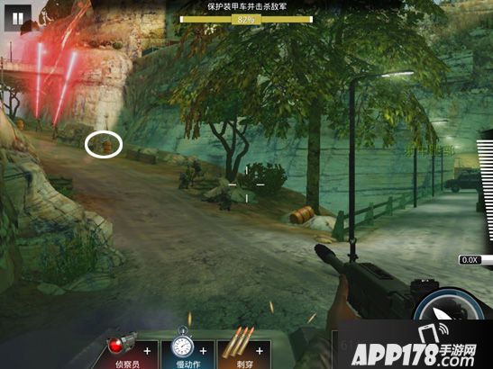 狙击手是很好辨识的,他们在寻找目标时,武器会有红色射线光。另外,如果地图中有油桶,图中画圈的部分,油桶爆炸可以炸死附近的士兵,在后面的其他任务也是如此。(如下图)
