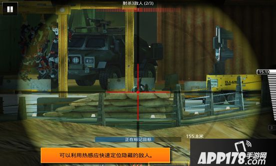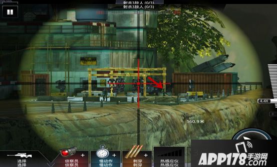 武器升级完毕后,便可以开始进行任务。这个任务关卡的敌人藏匿的有些隐秘,故在任务开始时,系统变会提醒通过热感应寻找敌人。而敌人的具体分布,是这样的(如下图)。