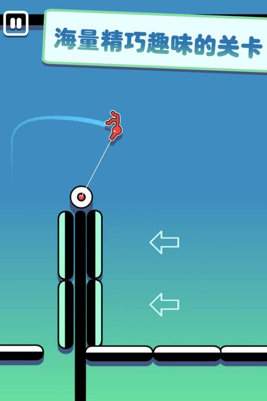 按下屏幕,施放抓钩,钩住屏幕中的吊索,火柴人会根据吊索的和勾线的角度自由摆动。当摆动到合适的角度,松开手指,火柴人会按照运动