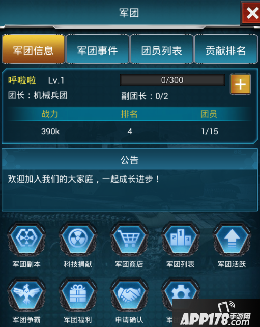 功能:进行军团功能操作的建筑。创建或加入军团、查看军团科技、军团商店、军团副本等。