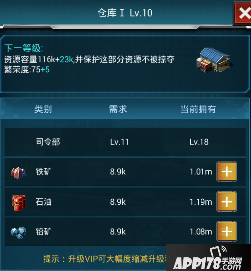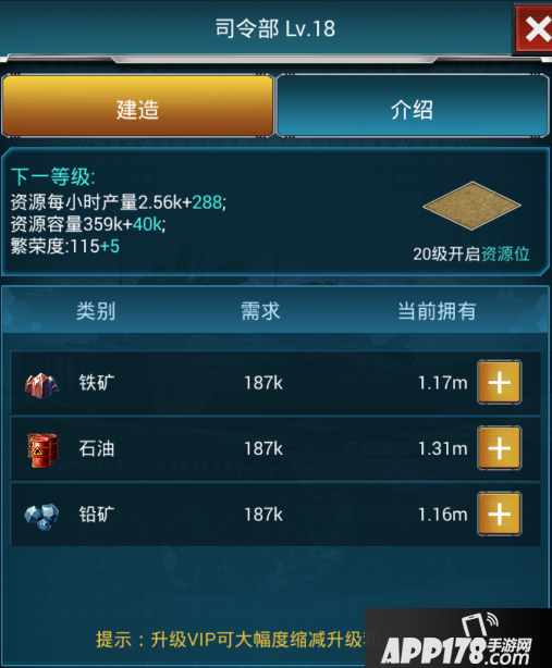 功能:升级司令部可提高5种资源的产量和储存容量,其他建筑等级不能超过司令部等级。