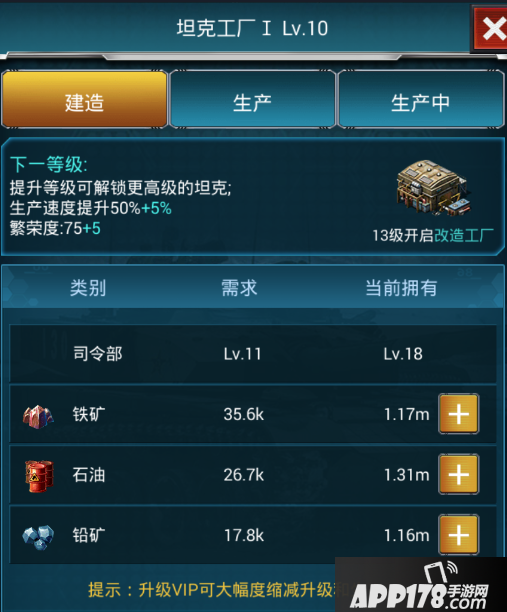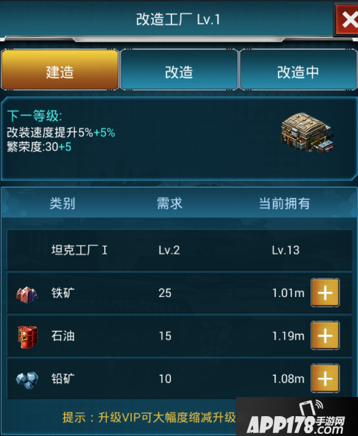 功能:将低级单位改造成高级单位的建筑。升级能加快单位改造速度;更高级的单位改造受限于坦克工厂的等级。