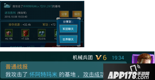 3)在战报详情界面,点击右上角的“分享”图标功能,即可将战报发送到“军团聊天”或“世界聊天”界面拉。发送到频道后,其他玩家即可点击该战报查看哦。