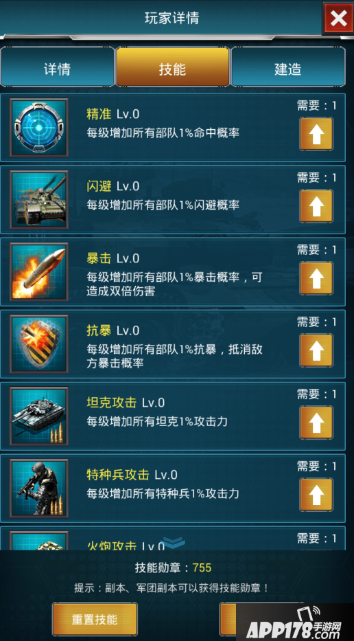 指挥官也可以通过升级自身技能,来提升战力。提升技能需要消耗技能勋章,技能勋章可通过【战役胜利、战役箱子、军团捐献、军团购买】来获得,另外最直接的方式也就是在【商城】进行购买,总而言之,指挥官除了要多多升级坦克之外,别忘了自我提升哦。指挥官除了前四种技能是必须之外,其他的需要根据自己的部队情况选择升级哦。
