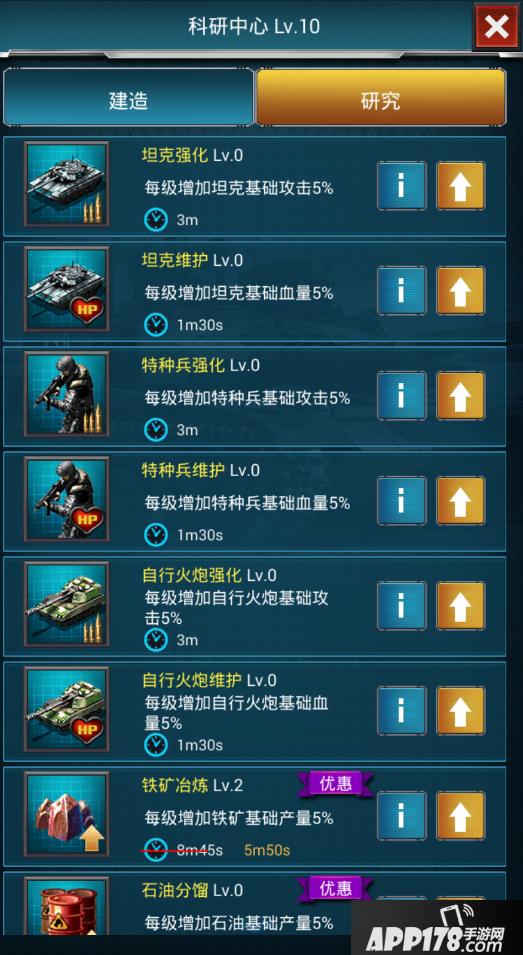 科研中心里面总共有17种研究,具体的大家可以点击:【科研中心-研究】进行查看哦,这里小编就不给大家一一罗列拉。当然小编不会告诉你,这里除了可以提升坦克的攻击跟血量属性外,还可以提高资源的储存、产量、战斗经验等哦。先不说了,小编已经在默默点击中了(^-^)V