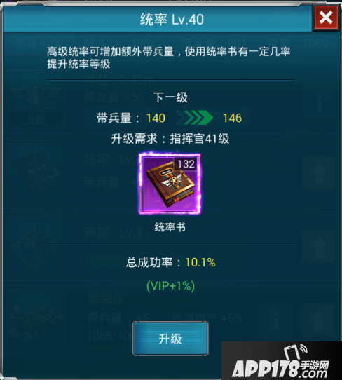 指挥官还可以通过提升统率等级,来提升带兵量。统率等级提升方法:点击左上角的人物头像会弹出“玩家详情”,之后点击:【统率—使用统率书】提升统率等级。当然统帅等级提升也是有几率的哦。统率等级越高,可带兵量就越高,带兵量越高相对战力也就越高哦。此外军衔等级也会有带兵量的提升哦,大家别忽略了军功的获得哦。