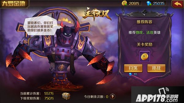 既然只需要猛烈地输出,自然不用去考虑带上防御型或治疗型的英雄了。但是要注意的一点是,大罗金池中每天的boss是不同的,有的自带超高的魔法防御,有的则有惊人的物理防御。硬碰硬是划不来的,玩家们可以根据boss的属性来选择合适的英雄出阵,以便打出最高伤害。