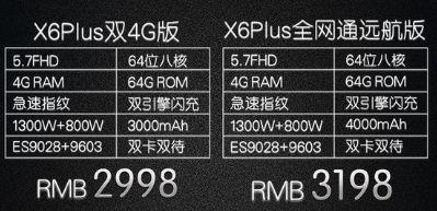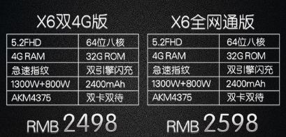 X6双4G版,售价2498;X6全网通版;售价2598;X6Plus双4G版,售价2998;X6Plus全网通远航版:3198。X6和X6Plus共有三种颜色:金色、银色、玫瑰金。