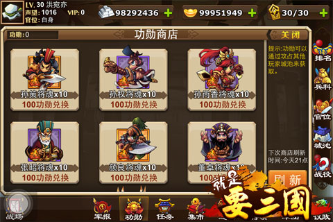 在《就是要三国》封测版本中,排行榜商店加入了橙色将领:夏侯惇、关羽、太史慈、马超,玉龙旗商店加入了橙色将领:曹操、刘备、孙权、黄忠,功勋商店加入了橙色将领:郭嘉、诸葛亮、周瑜、张飞。使得进行PVP战斗成为提升部队实力的必经之路。此外,我们还从从排行榜中添加进入排行榜商店的功能按钮,从玉龙旗中添加进入玉龙旗商店的功能按钮。让你轻松的实现从战场到商店的界面切换。