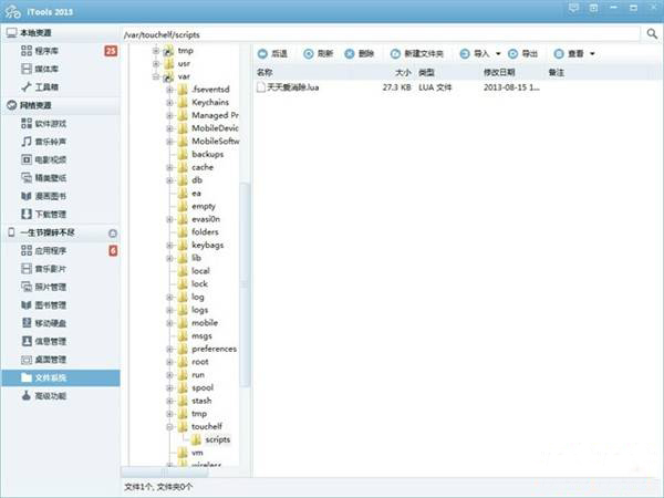 第三步:将手机设备和itools相连,然后找到文件系统,就是小编要求的越狱系统,把我们之前下载的那个文件包复制到/var/touchelf/scripts里面。