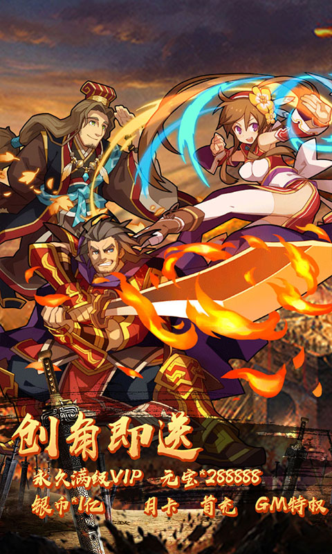 1、上线即送永久满级VIP,288888元宝,1亿银币,GM特权1,体力*300,月卡*1,首充*1