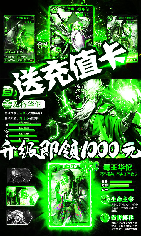 2.首充比例三倍!充值比例1:1000!15级领取1000元充值卡,极品武将抽到手软!