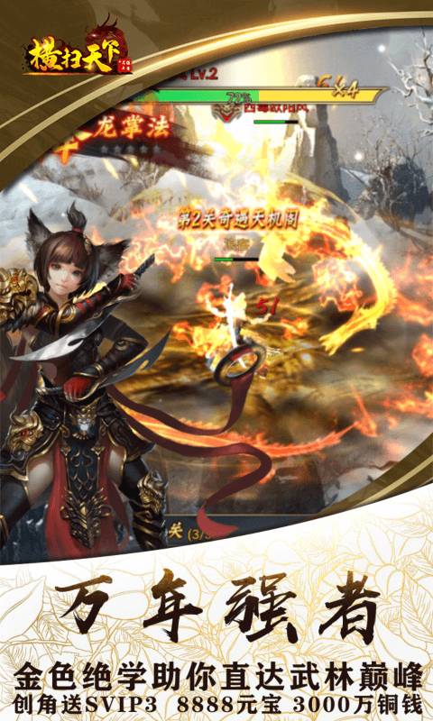 1.上线就送SVIP3,元宝*8888,铜钱*3000W,过关完成任务就能免费激活VIP