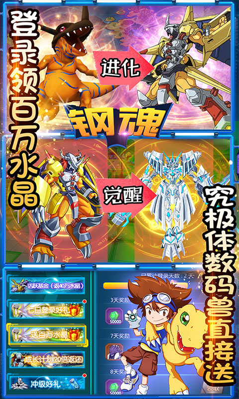 送百万水晶说明:游戏内设置有永久的登录活动,只要登录即可领取总共百万的水晶奖励,更有究极体数码宝贝,超究极体数码宝贝赠送。