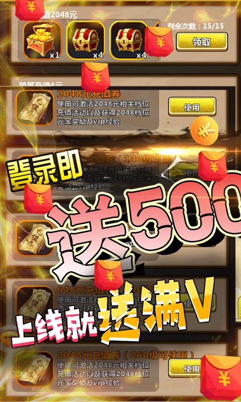 1、飞升三国超V版登录送满V:登录即送满级VIP(VIP15级)
