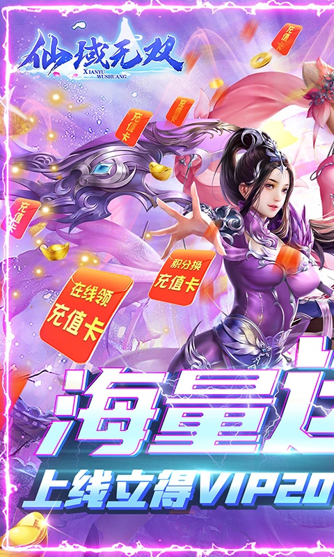 《仙域无双(海量神充卡)》经典仙侠情缘3DMMO手游,史上最强福利来袭:上线送VIP20、元宝88888,千元充值卡,永久钻石仙尊特权。每日在线就能领充值卡,小怪高爆率掉落充值卡!充值卡还可合成神充卡,可获得VIP经验!商城充值1:800打造全新福利手游!实时强战PK,跨服巅峰对决,让你在修仙的世界里,享受非凡的热血战斗!