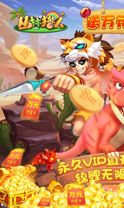 超高人气始祖IP回归,3D高画质全新演绎!官方正版石器手游巨作《丛林猎人-送万元充值》怀旧激萌的游戏画风,带你进入史前的石器部落,拿起石斧、捕获骑宠和野兽去战斗!上线赠送V10,28888钻石,500w铜币,永久尊贵VIP特权登录即送,每天登录送万元现金充值卡,还有每日锦鲤惊喜大奖,海量现金充值卡等你来抽取!游戏融合了休闲放置元素,从萌萌的宠物,奇幻的恐龙异兽中挑选成员组建你的小队,多种坐骑任你挑选,呆萌的巨型霸王龙,凶狠但软萌的剑齿虎,超多史前萌宠等着被捕获驯化,更有丰厚的上线壕礼送不停!重返石器大陆,开发烧脑策略套路,成为传说中的绝活哥!