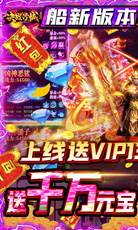 1.上线即送满VIP13+1000W元宝+十万天道币+8888钻石+炫酷时装称号