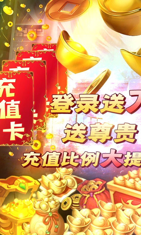 送万元充值说明:创角就送VIP10再送千万真元宝,顶级武器-焚天免费拿,连续登录还送万元充值卡!