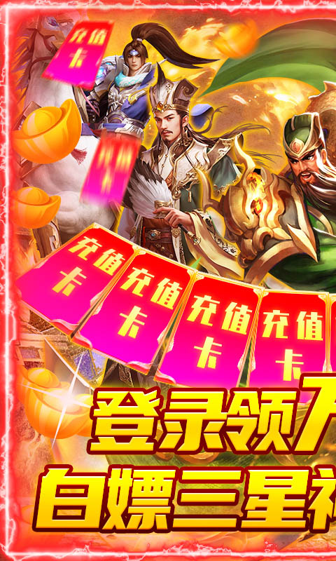 1、主界面天天送充值活动,每日登陆免费领取总额超1W元充值卡和三星神将碎片,每月重置