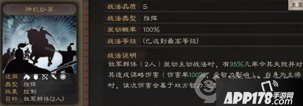 【指挥战法】神机妙算:敌军2人发动主动战法时,有几率失败并对其造成谋略伤害。自身为主将时,伤害会基于智力属性差额外提高。