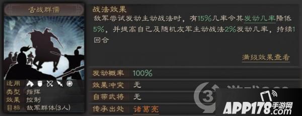 可拆战法【指挥战法】舌战群儒:敌军发动主动战法时有概率降低发动几率,并提升自己和随机友军的主动战法发动几率。