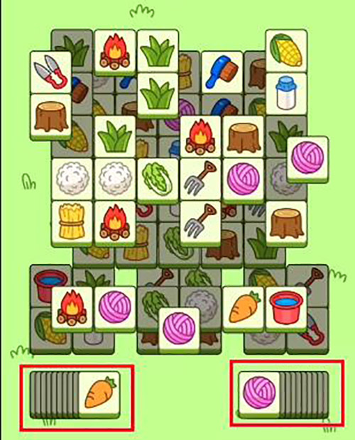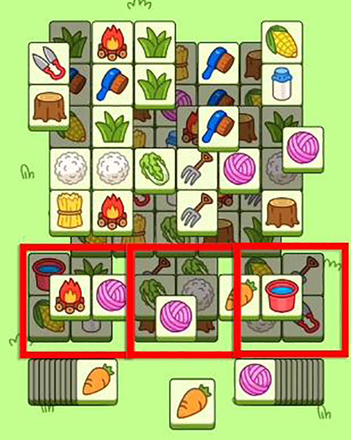 2、同层可以三消的就先消除同层,没有的话就需要查看下一层的物品,然后将需要的物品的上方的道具放置到槽中获得下方的道具。