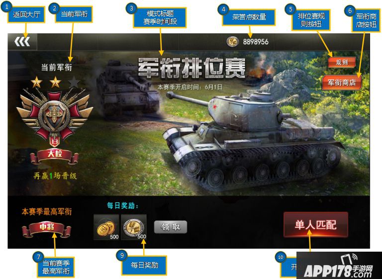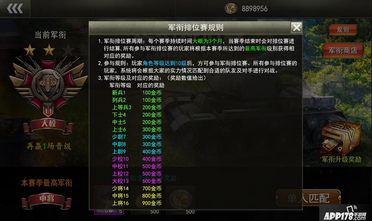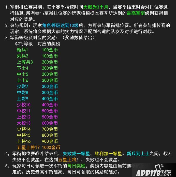 2,参与规则:玩家角色等级达到10级后,方可参与军衔排位赛。所有参与排位赛的玩家,系统将会根据大家的实力情况匹配到合适的队友及对手进行对战。