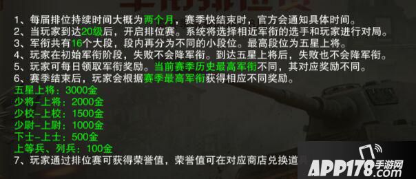 1,军衔排位赛周期:每个赛季持续时间大概为3个月,当赛季结束时会对排位赛进行结算,所有参与军衔排位赛的玩家将根据本赛季所达到的最高军衔级别获得相对应的奖励。