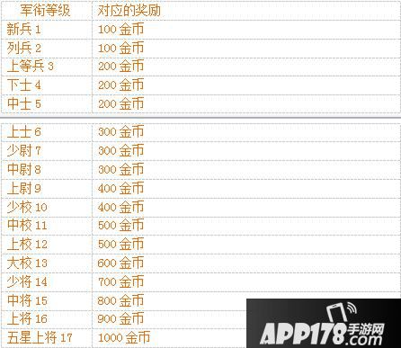 3,军衔等级及对应的奖励:(奖励数值给出)