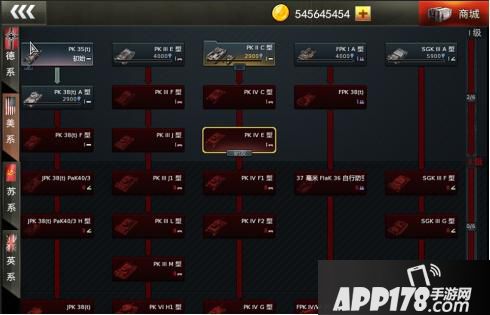 坦克按国家分为德系、美系、英系、苏系四类,玩家可以随意选择研发任意国家的坦克。