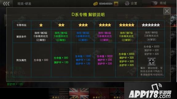 每个国家的坦克研发都有专精等级,研发越高级的精英坦克,就可以获得更高级的坦克专精等级。越高的专精等级,提供的附加属性也就越多。