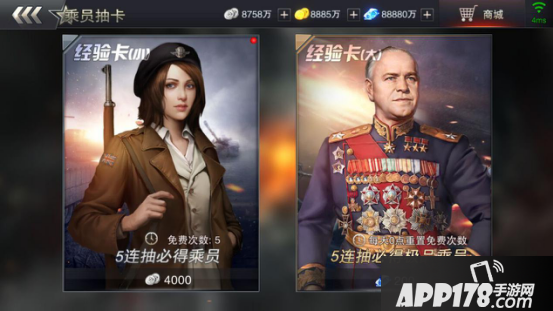还有就是抽卡,是车长获得最常用的方式!5连抽抽必的极品,还有一定时间就能获得免费抽取的机会,如此给力!还不快来加入战斗!