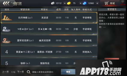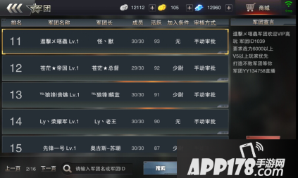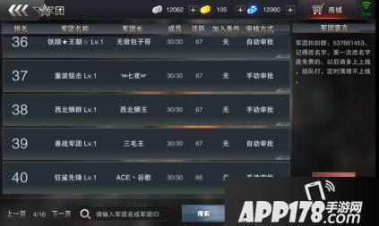 现阶段的军团总数已经达到了16P,各式各样的军团让您眼花缭乱,想加入某个军团那就点击这个军团,然后在右侧就会弹出该军团相应的要求,基本上属于军团长和团副提出的要求。军团的排位是根据活跃度进行排列的,所以如果您是长期在线建议您的选择可以按顺序挑选自己喜欢的军团。