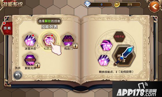 到了3级,我们就可以装备第二个技能了: 首先,在界面点开技能系统