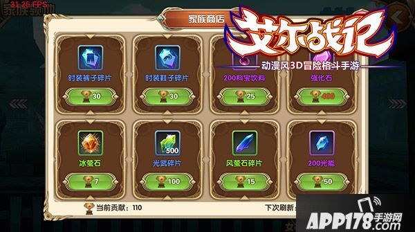 在家族各类玩法中获得的家族贡献,可以用在家族商店中兑换奖励,其中有时装碎片、强化石、科宝饮料、宝石、光武碎片等。所以,一起为家族努力吧!