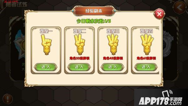经验试炼副本每天可挑战5次,根据等级开放更高难度副本。当然啦~高难度的副本给予的经验可是会亮瞎你的眼哦~!