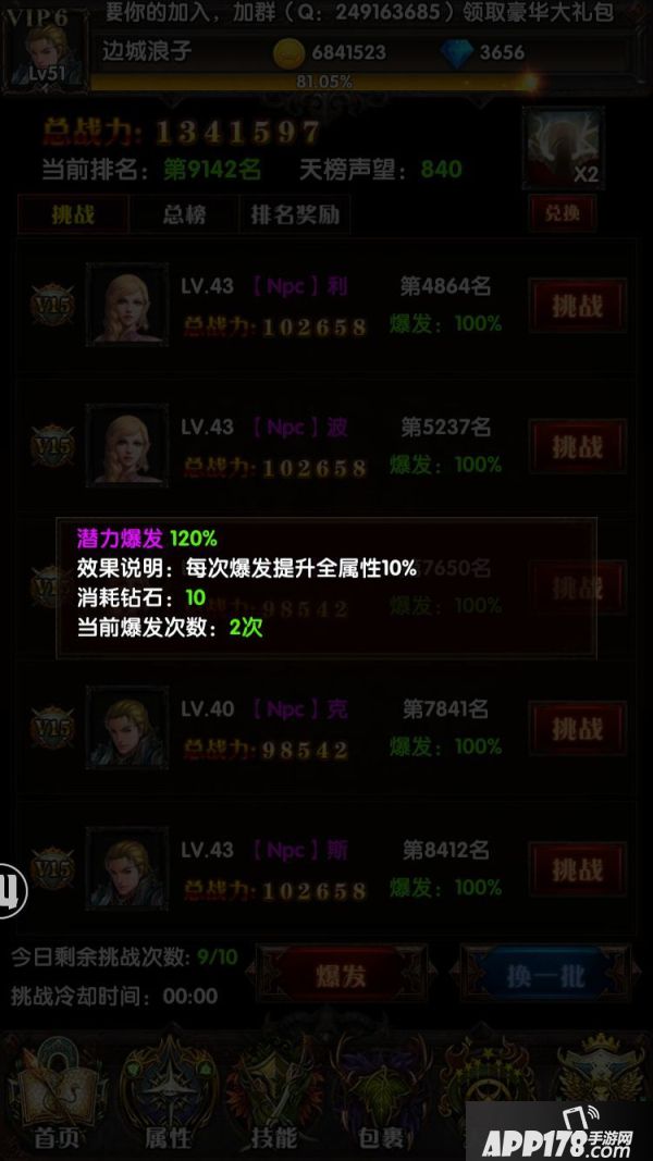 一般来说,游戏内的大R因为有了强大的财力投入,装备等级和强化程度都较高,相应的战力也会较高,那么屌丝玩家是不是在PK上就一定会落下风呢,答案是不一定,天榜PK为用户提供了爆发的选择,爆发有可能将玩家的属性实现一定比例的提升,而且爆发效果可以叠加(见下图示例),这就为屌丝逆袭大R营造了可能性。