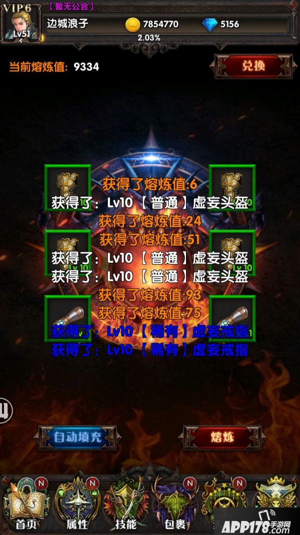 第三步:填充完毕后,点击页面右下角的熔炼按钮,系统就开始不停的将低级装备进行熔炼,同时不断的产生熔炼值。