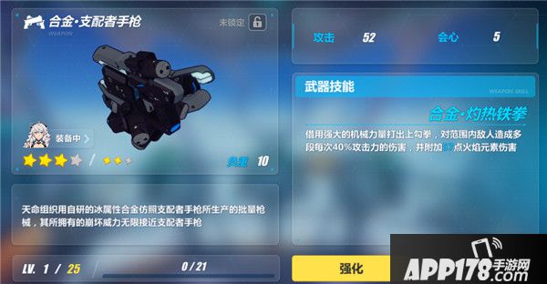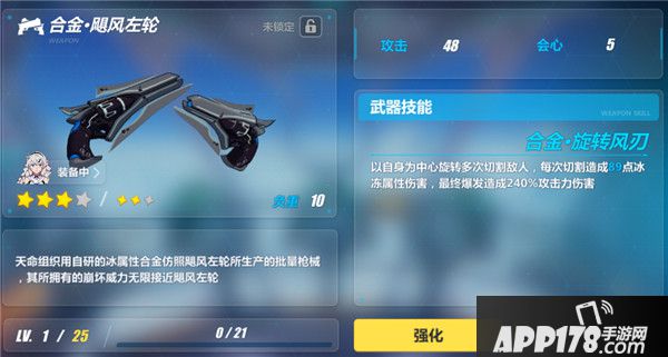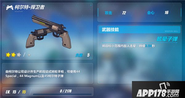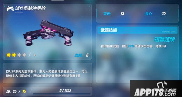 需要在第一章收集至少81枚勋章,面板和【试作型脉冲手枪】没多大差距,但最高星级仅为三星,唯一优势在它的主动技能,将敌人眩晕不仅可以使出布洛妮娅「战车」的QTE攻击,还能强制控制一些难缠的敌人为我方赢得输出时间,如果到手的时候并未对【试作型脉冲手枪】投入太多资源,那么用这把小手枪也是不错的选择。