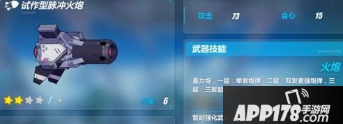 【试作型脉冲火炮】需要到1-31才能入手,和其他两把【试作型】武器相比入手时间有点晚,但能升级到四星的特性和简单粗暴的主动技能都保证了它的实用性。