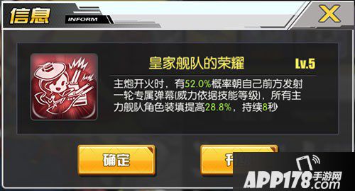 主炮开火时,有40%(40+3.3*8+3.6=70%)概率朝自己前方发射一轮专属弹幕(威力依据技能等级),所有主力舰队角色装填提高20.0%(20+2.2*8+2.4=40%),持续8秒