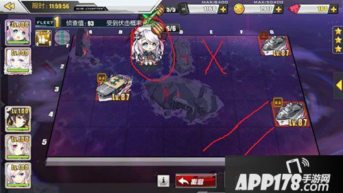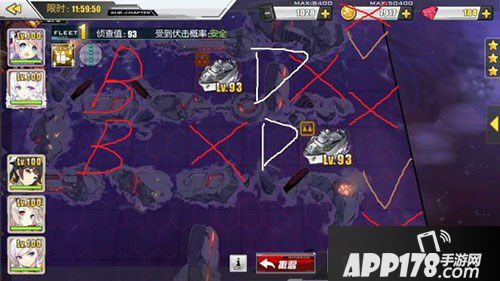 开局建议BOSS队走到V字所示位置,走不到建议撤退重进。道中队伍如果第一战不是红叉所示的几个点位需要考虑撤退重新进。