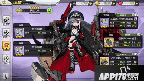 设备:通用装备推荐大家除了鱼雷舱之外,最好携带辅助性装备而不是加耐久的,原因是由于德意志对比塔爷和贝爷她的耐性略高。携带紫色弹链对德意志的主炮收益相当高。