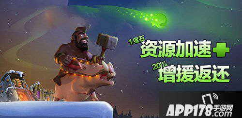 维护后一宝石加速采集器的限时特惠活动就要开始啦,除此之外,在活动期间部落增援将额外获得20%的资源返还!