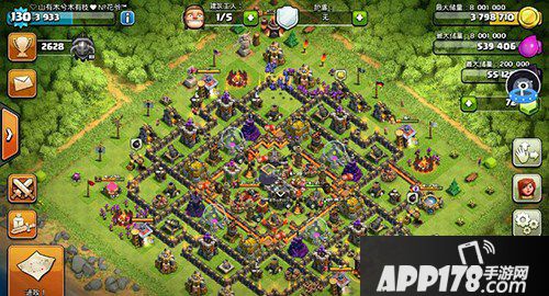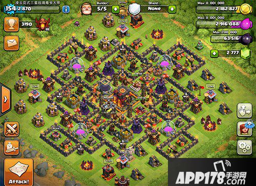 在这里我提醒大家,特别要注意一些阵型,例如BUG塔在内圈护大本,而外圈全是分摊的一个个小格子分库的阵,且内圈与外圈距离较远,确保内圈的地狱塔无法攻击到外圈的女王,碰上这种阵型,女王千万要引导其在外围进行攻击,不要使用炸弹开墙,就靠着天女滑步与亡灵配合,基本上8个大库能带走6.7个。