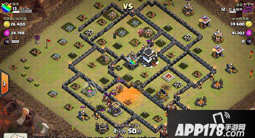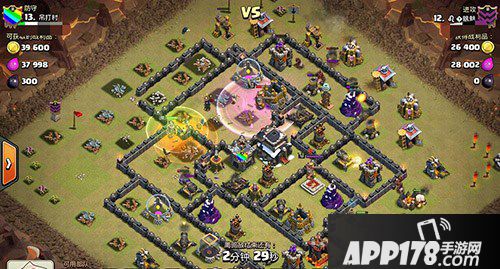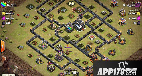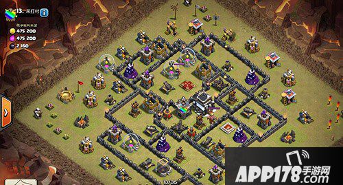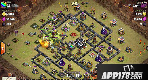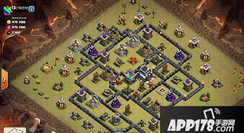 从这张图可以看出,是最近流行的不规则防3阵,女王一边3点方向防御稀疏,而反面的9点方向防御密集,而且电塔陷阱也集中在那里