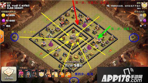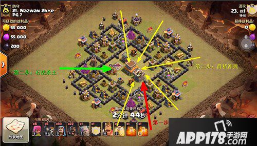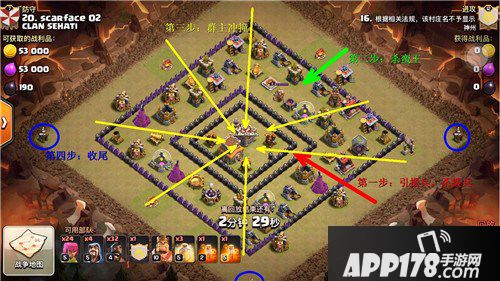 这打法采用点猪分散伤害,逐个击破所有周边防御,最后汇聚中心,完成三星。而且对付这样回字形的防龙阵,效果更好