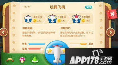 玩具飞机是一款超强穿透炮塔,消灭怪物清除场上道具的神兵利器。将它建造在直路的尽头,效果拔群,还能瞄准近处的怪物隔山打牛!在比赛模式中,玩具飞机+月亮+雪花的王者搭配,再加上必小胜5%加成,相信一定可以帮助萝卜丝取得新佳绩!